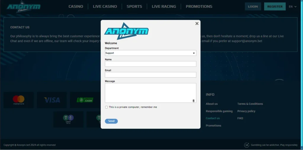 If you have a withdrawal issue at Anonym Bet Online Casino, you should contact customer support.