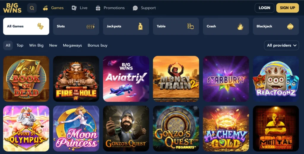 Big Wins makes sure you have a great time as a customer. The main colors on their site are blue, black, gold, and white. They mix well. You can tell the choices apart easy because the letters and symbols are big and clear. They don’t crowd the homepage with too many symbols. It’s easy to move around and find different games right from the start page. But, you only see a few game options at once; you can scroll to see more.