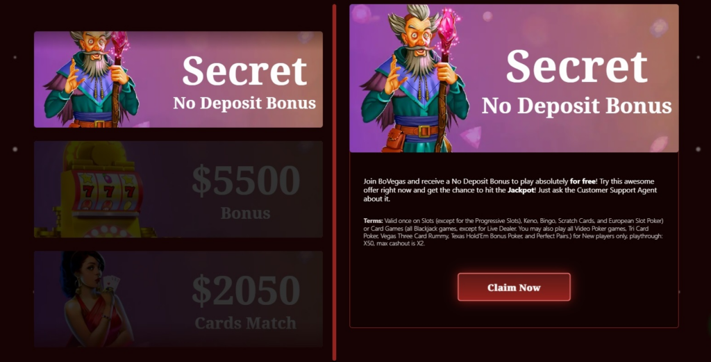 BoVegas Casino holds a cool secret free-play deal. Sign up at BoVegas Casino and grab it to play at no cost! Give this great deal a try now and you could win big! Just chat with the Help Team to learn more.