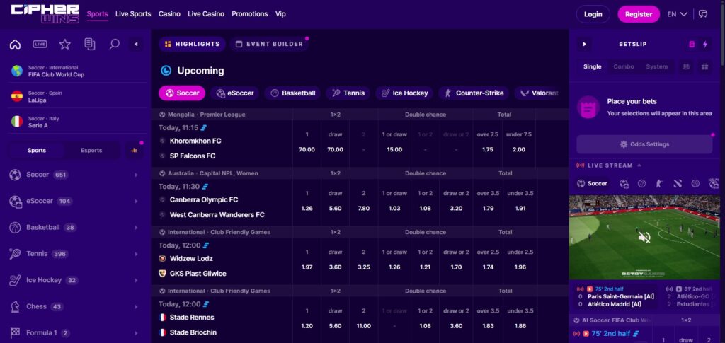Cipherwins Casino doesn’t limit itself to slots and table games. The site also features an active betting section with thousands of real and virtual sporting events, as well as a full catalogue of esports. Here’s what you’ll find.
