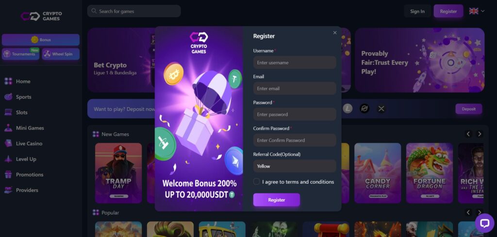 Crypto-Games Casino uses a minimal but effective layout that keeps things organised and easy to understand. At the top of the screen, you’ll find the Sign In and Register buttons. These are visible and simple to use, allowing quick access for both returning and new players.