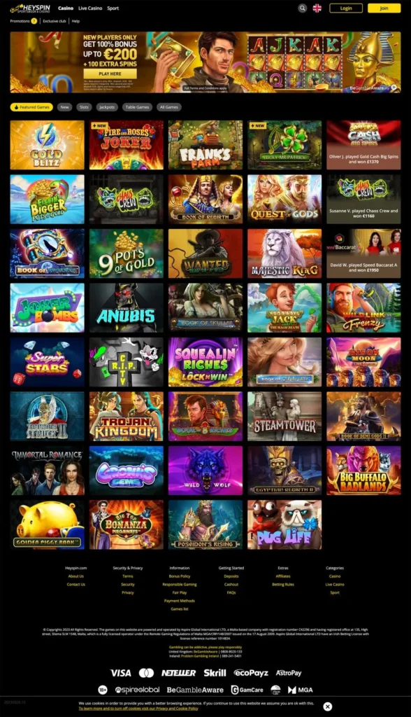 After obtaining licences to operate in Ontario, Denmark, and the Netherlands, Aspire Global has been doing well lately. It was nominated for three SBC Awards categories in 2022, including Platform Provider of the Year and Employer of the Year. In order to determine whether HeySpin Casino UK lives up to the operator’s illustrious reputation, our study will look at every facet of the casino.