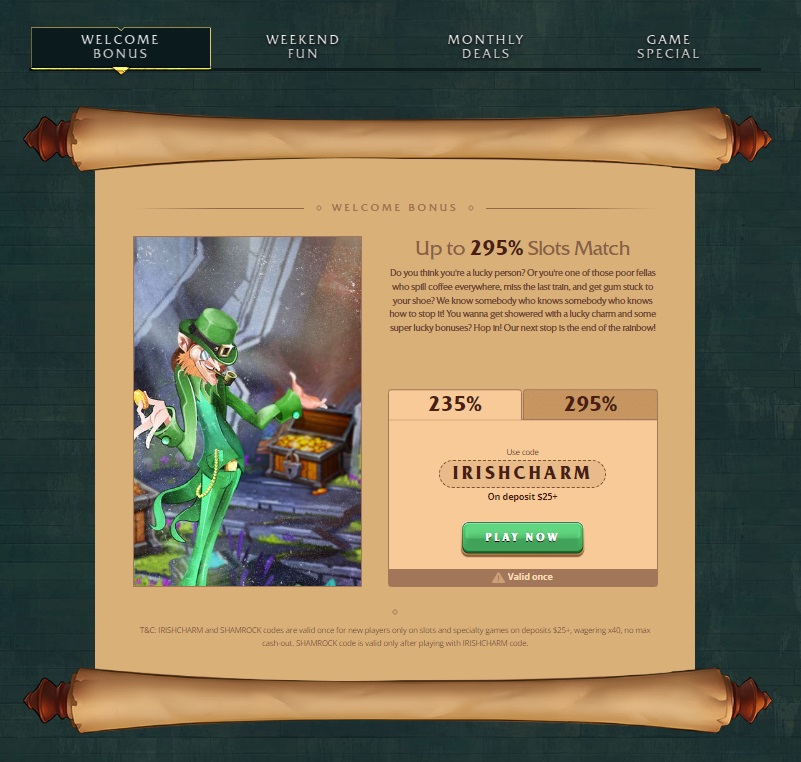 The Irish Luck Casino now has no free bonus deals. But, the place asks you to check out many good offers and perks, like those for first-time cash puts: