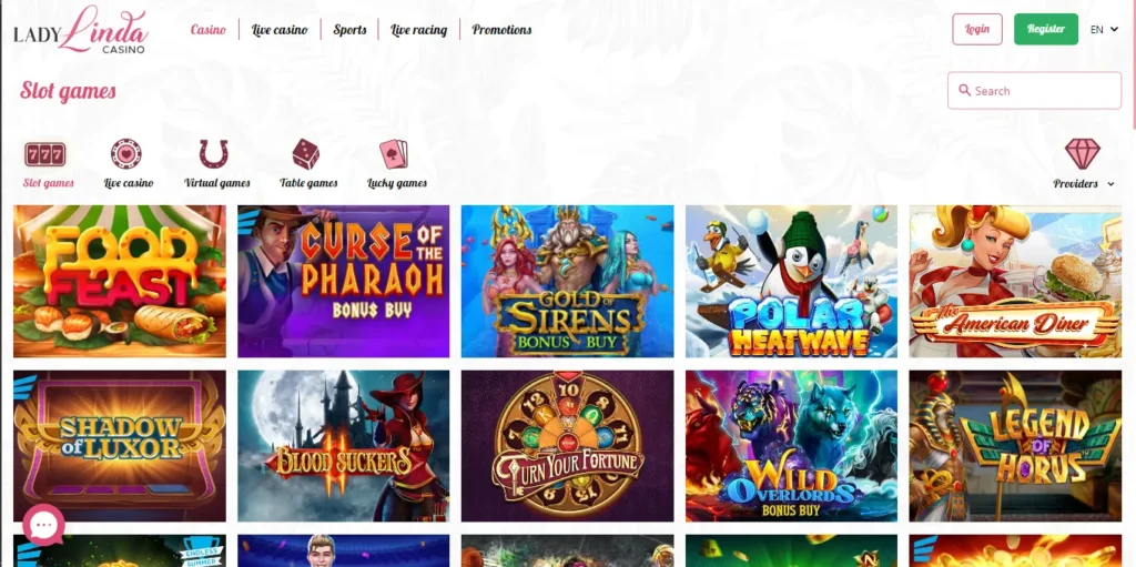 This casino’s best offer is the slot games at Lady Linda. When you go to the slots section, you can see the whole collection with lots of themes and cool design. The game providers are Play N Go, Amatic, Betsoft, and Evoplay. In all, Lady Linda has about 2,300 games. There are also some different games for players to enjoy. You can try most games for free to see if you like them.