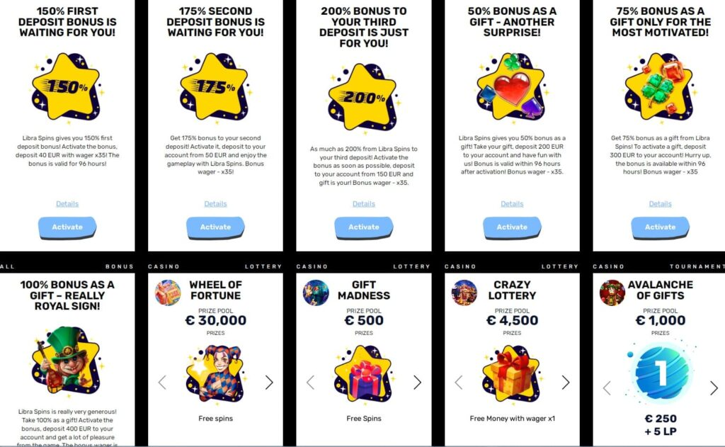 As you can tell, all these deals need money first; to get a bonus, you must pay in some cash. Go to the real Libra Spins Casino site to know more about the bonuses they have.