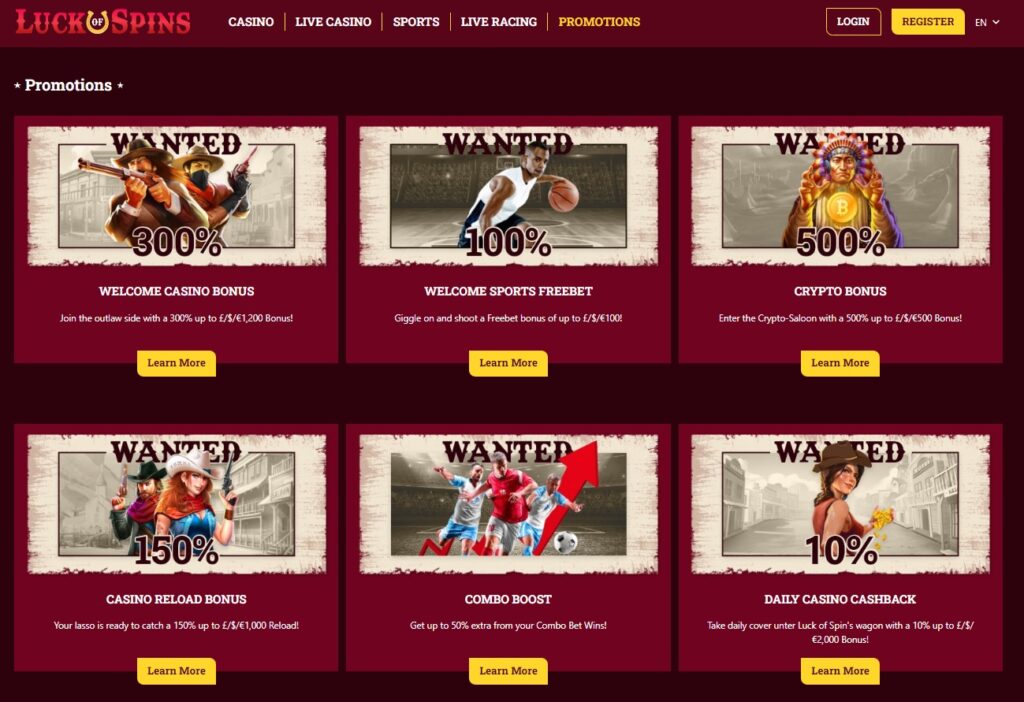 Luck of Spins Casino offers players many great bonuses and promotions. You can find all the available bonuses on the casino website or in your account.