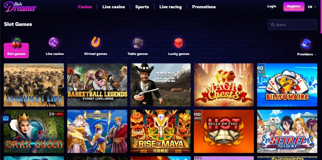 Slots Dreamer Casino works with top software companies to offer a big variety of fun and fair games. You can find slot machines, live casinos, virtual games, lucky games, bingo, and table games in the lobby. All games are playable on mobile. Here are some exciting slot games on the platform: