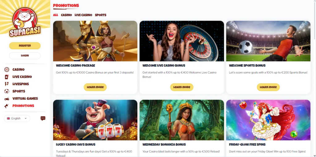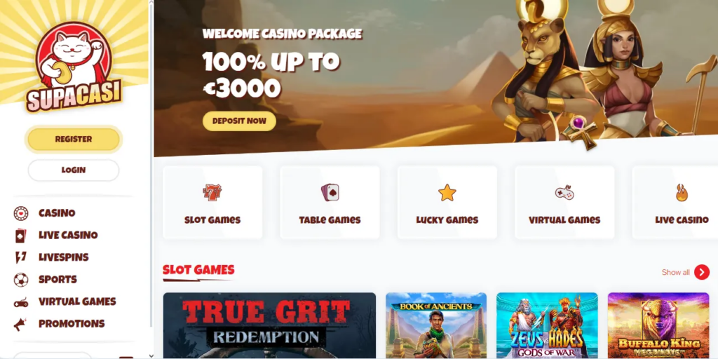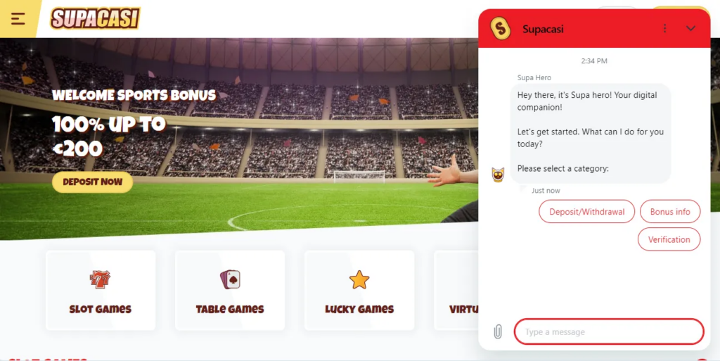 There are already five sections on the main page to help you navigate: “slot games,” “table games,” “lucky games,” “virtual games,” and “live casino.” Of course, you may always use the search box to find the specific Supacasi slot you’re looking for from the 7,100+ that are available.