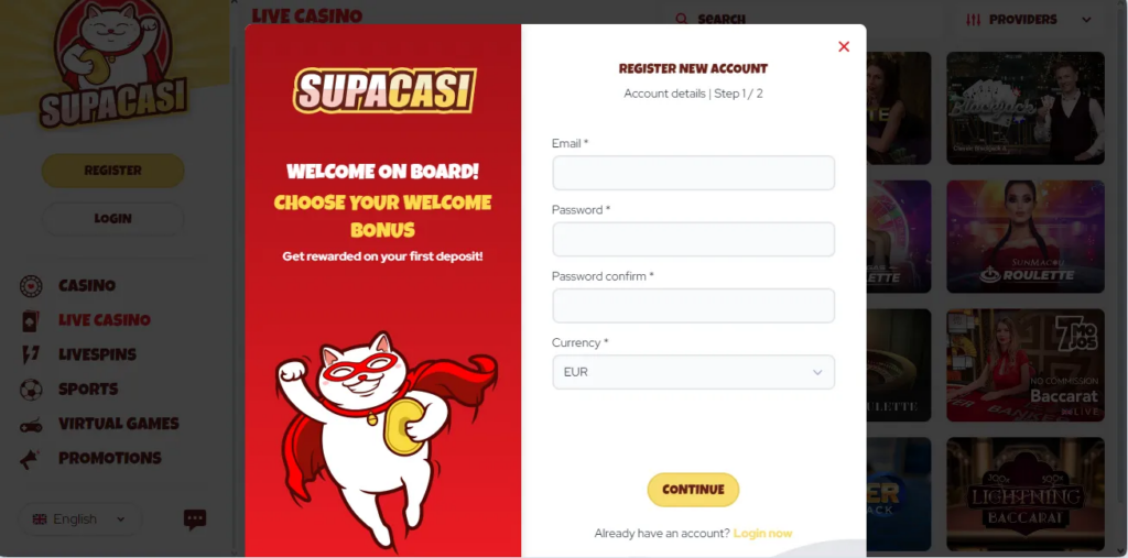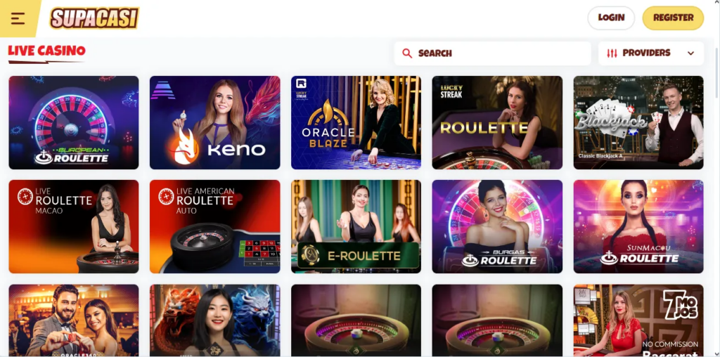 Supacasi deserves special recognition for its excellent live offering, which is immersive. The existence of certain less accessible games, such live Sic Bo, live Roulette, and live Backgammon, is just as impressive as the total numbers. Among the leading live providers are well-known brands like Ezugi, LuckyStreak, and Evolution Gaming.